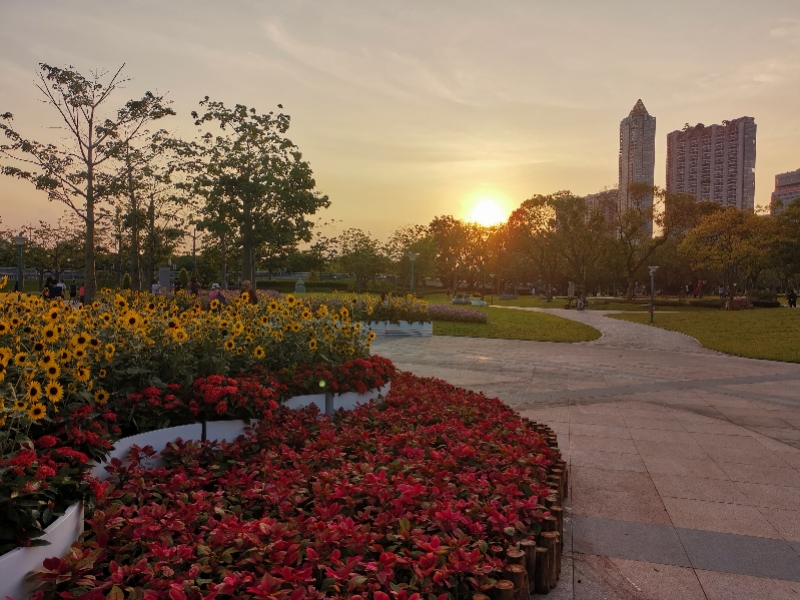 7月4日19时许,广州二沙岛东,落日余晖下的鲜花。陈君敏 摄